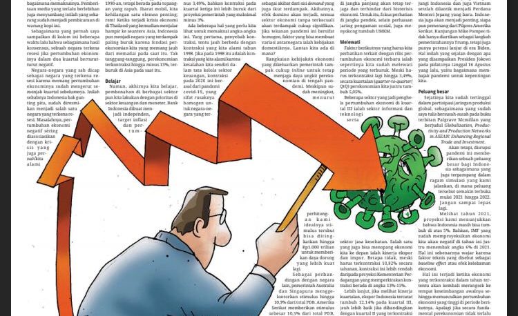 Sejatinya kita sudah tertinggal dalam partisipasi jaringan produksi global, sebagaimana yang sudah saya tulis bersusah-susah pada buku terbitan Palgrave Mcmillan yang berjudul Globalization, Productivity and Production Networks in ASEAN: Enhancing Regional Trade and Investment. Akan tetapi, disrupsi pandemi ini memberikan sebuah peluang besar bagi Indonesia sebagaimana yang juga terpampang dalam ragam simulasi yang kami jalankan, di mana peluang tersebut semakin terbuka mulai 2021 hingga 2022. Jangan sampai lepas lagi. Melihat tahun 2021, proyeksi kami menunjukkan bahwa Indonesia masih bisa tumbuh di atas 5%. Bahkan, IMF yang sudah memproyeksikan ekonomi kita akan negatif di tahun ini justru menembak angka 6% di 2021. Hal ini sebenarnya wajar karena faktor teknis yang disebut sebagai baseline effect atau efek kelebaman ekonomi. Hal ini terjadi ketika ekonomi yang terkontraksi dalam tahun tertentu akan kembali merangsek ke tempat keseimbangan awalnya sehingga memunculkan pertumbuhan ekonomi yang tinggi di periode berikutnya. Apalagi jika secara fundamental perekonomian tidak terlalu bermasalah. Karena itu, resesi tidak selalu berujung krisis. Yang jelas, resesi hampir berubah menjadi jargon yang mudah terucap dan gampang dipolitisasi karena pemahaman akan makna yang tidak lengkap. Sebagaimana perdebatan saya dengan kolega kandidat doktor hukum dari Melbourne itu mengenai neoliberalisme, yang dalam perspektif saya sudah menjadi jargon semata. Semoga dia tidak marah melihat kesimpulan saya ini.